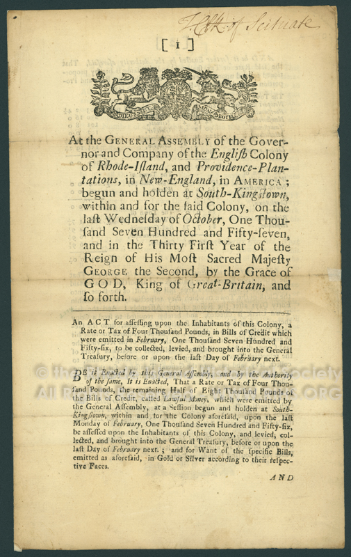 An Act for assessing upon the inhabitants of this colony, a rate or tax of four thousand pounds, in bills of credit which were emitted in February, one thousand seven hundred and fifty-six : to be collected, levied, and brought into the General Treasury, before or upon the last day of February next.
