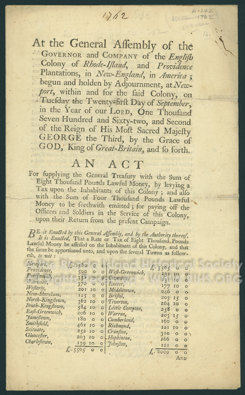 An Act for supplying the General Treasury with the sum of eight thousand pounds lawful money, by levying a tax upon the inhabitants of this Colony; and also with the sum of four thousand pounds lawful money to be forthwith emitted : for paying off the officers and soldiers in the service of this Colony, upon their return from the present campaign.