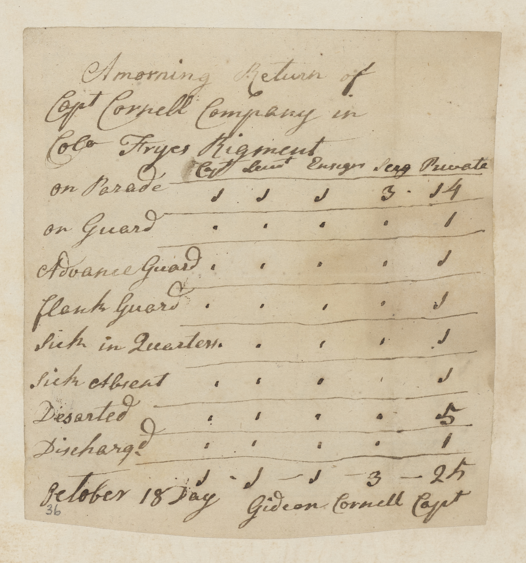 Morning return of Captain Gideon Cornell’s Company, Colonel Richard Fry’s Regiment, Tiverton, 18 October 1777